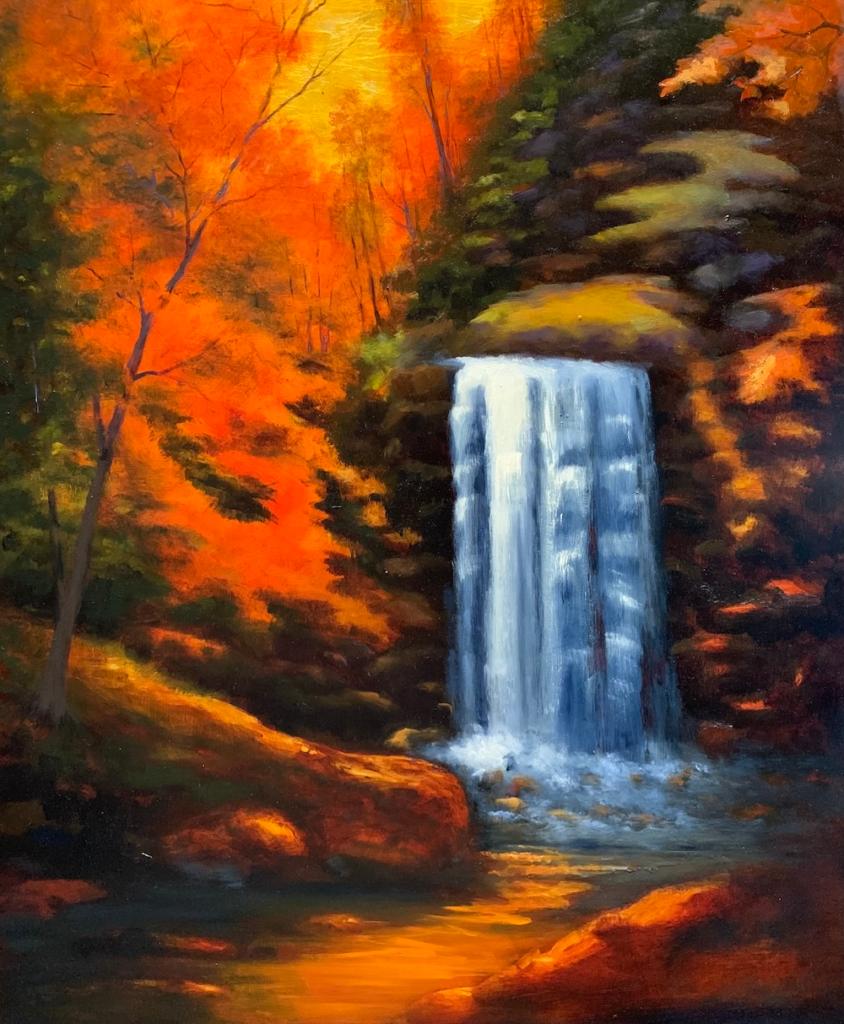 One of the highlights of the Blue Ridge Parkway is Looking Glass Falls. This painting features it in autumn splendor.