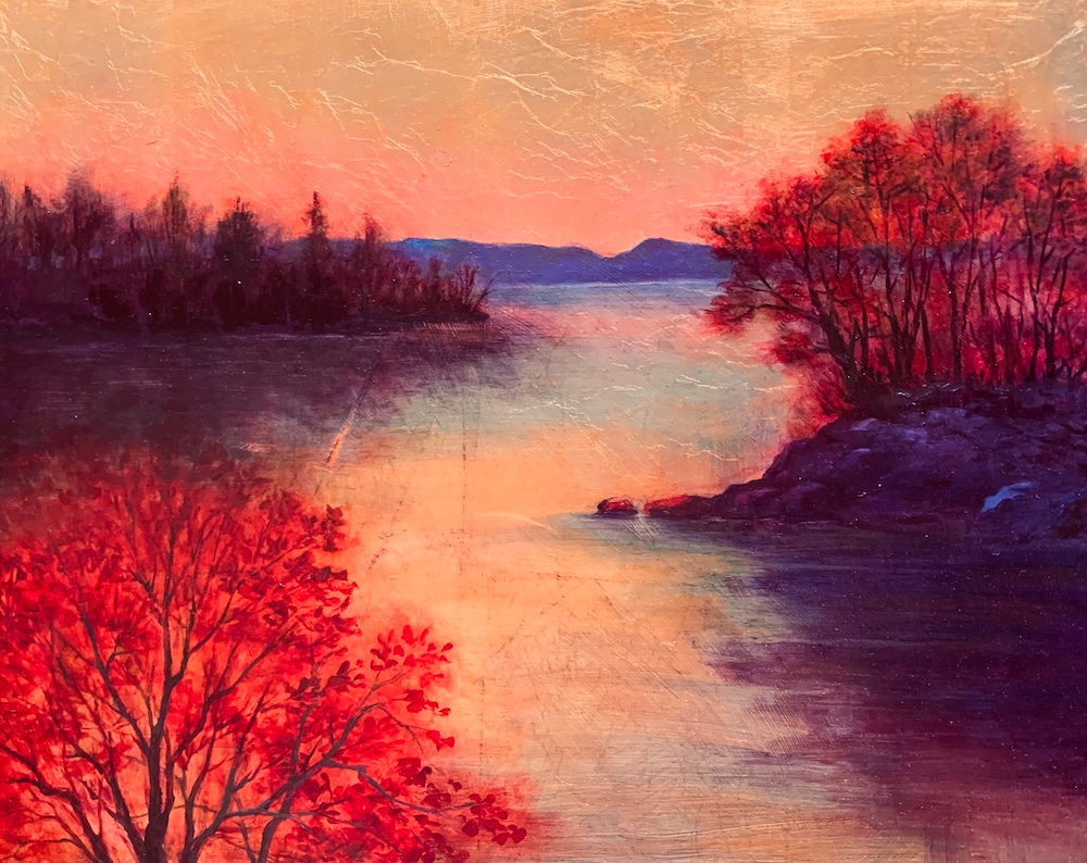 "Sunset on Lake George" 2026- Oil and gold leaf, 16 x 20